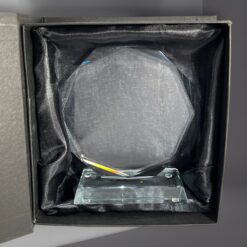 Elegáns kristály plakett díszes széllel, selyemfényű szatén bélelésű díszdobozban. A plakett átmérője 11 cm.