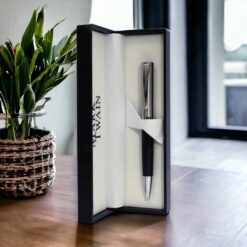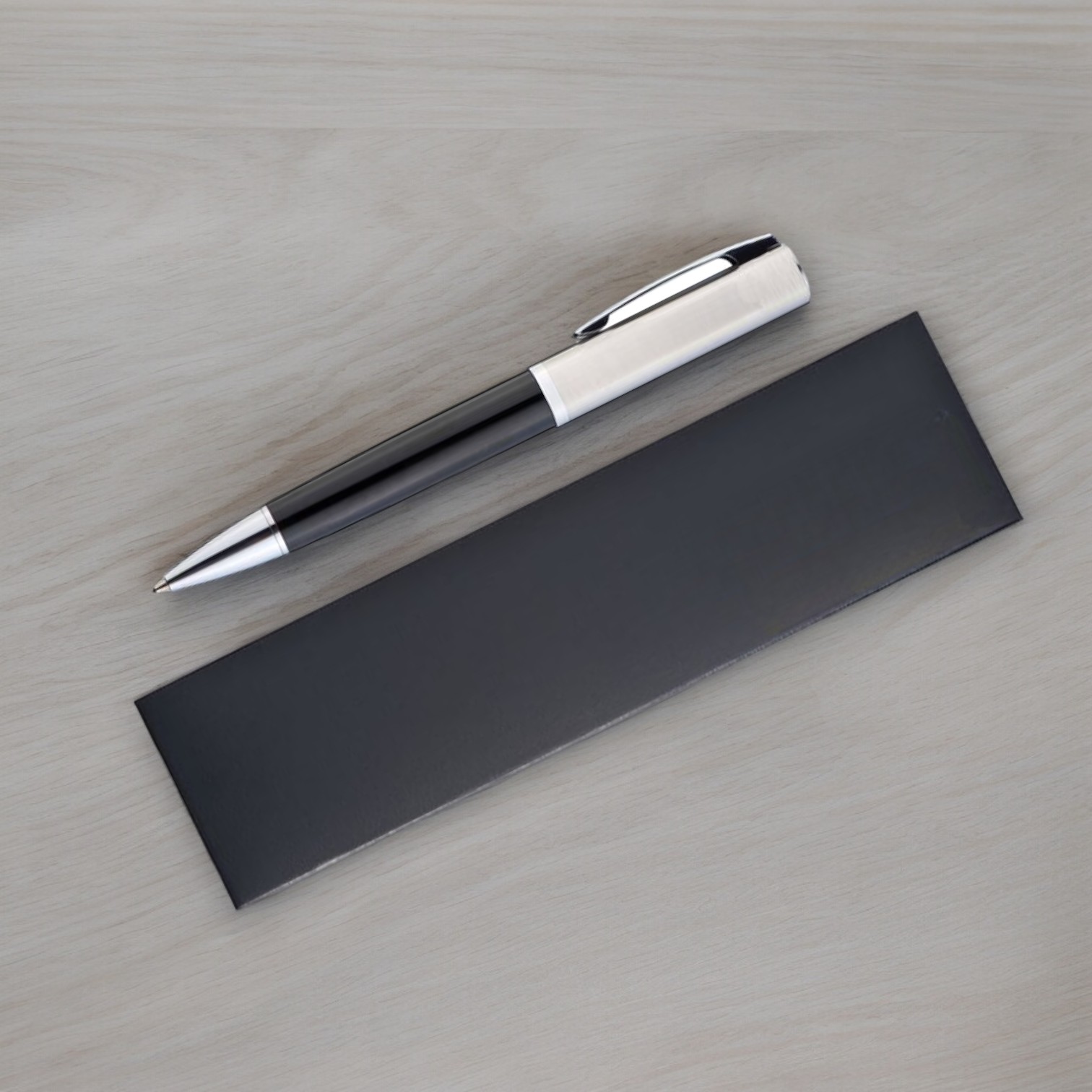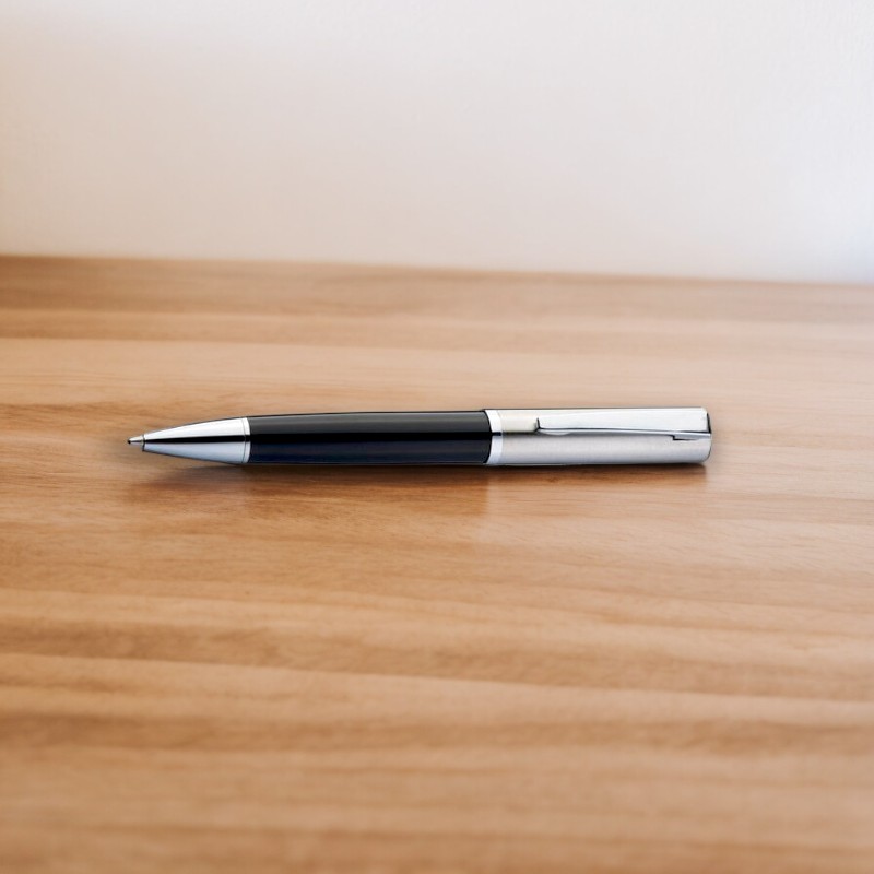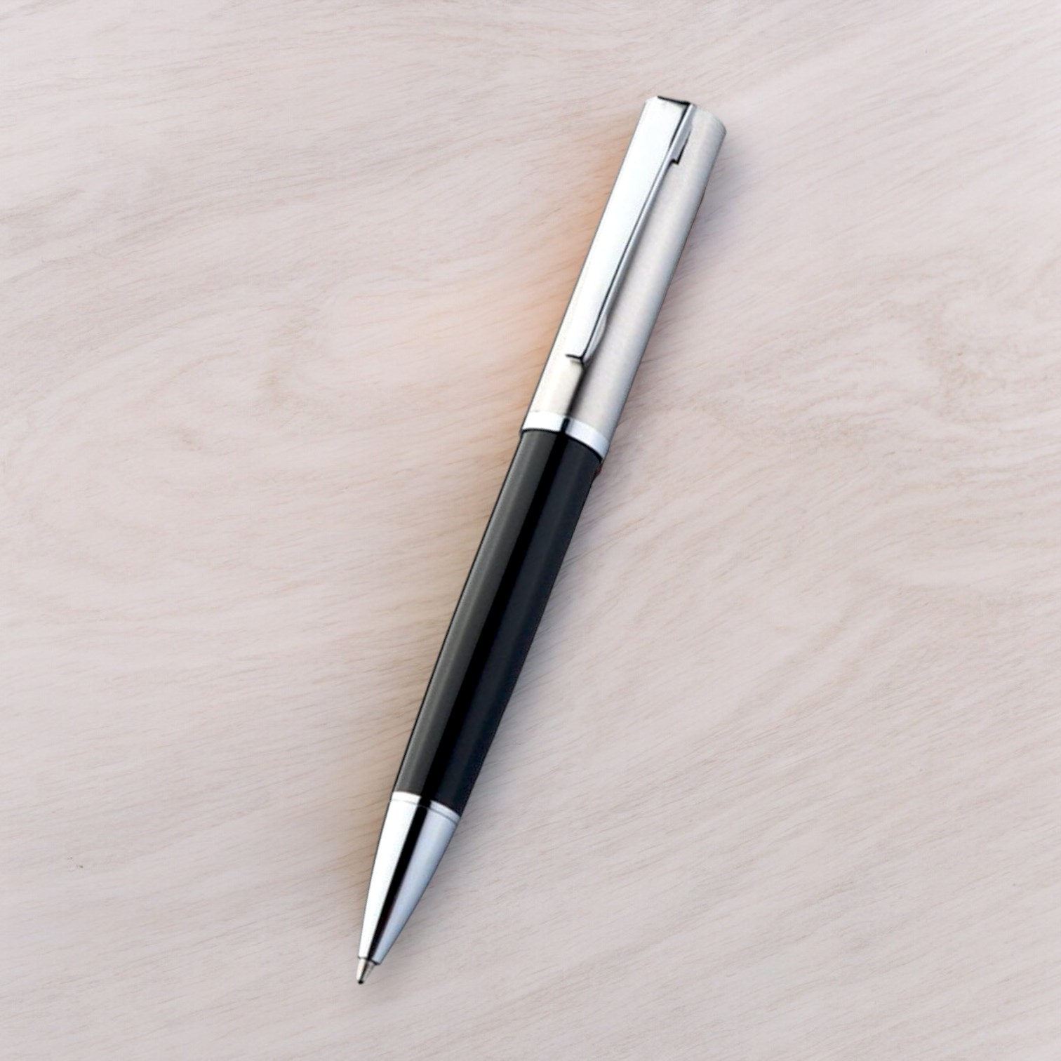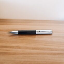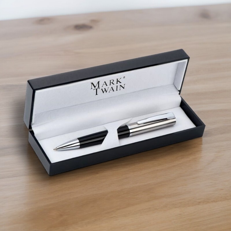 Kiváló minőségű csavaró mechanikás Mark Twain golyóstoll. Gravírozható ezüst színű felső fém résszel és fényes fekete markolattal.