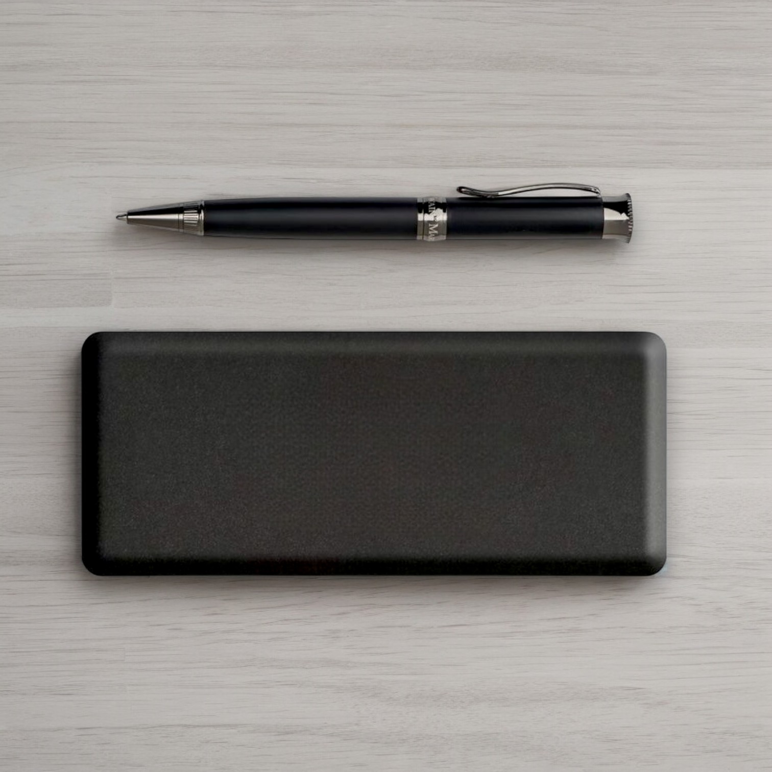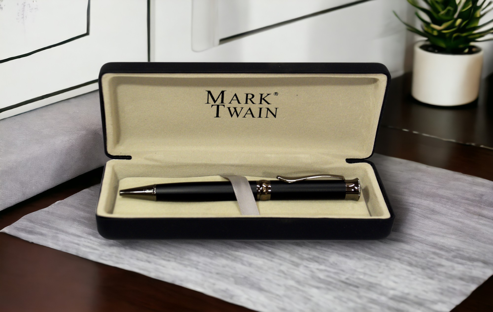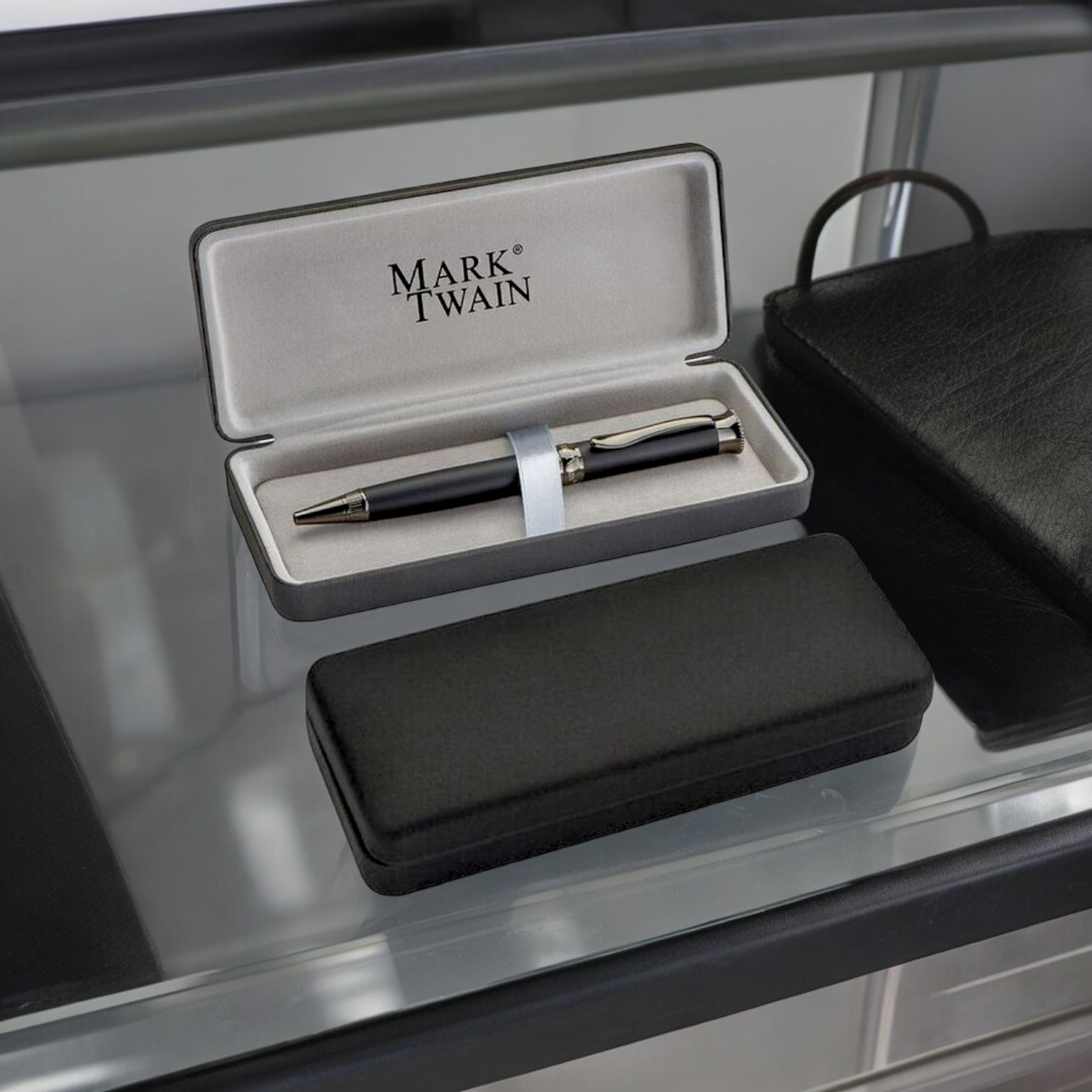 Mark Twain fekete gumírozott fém golyóstoll, sötét krómozott elemekkel és kéken író tollbetéttel.