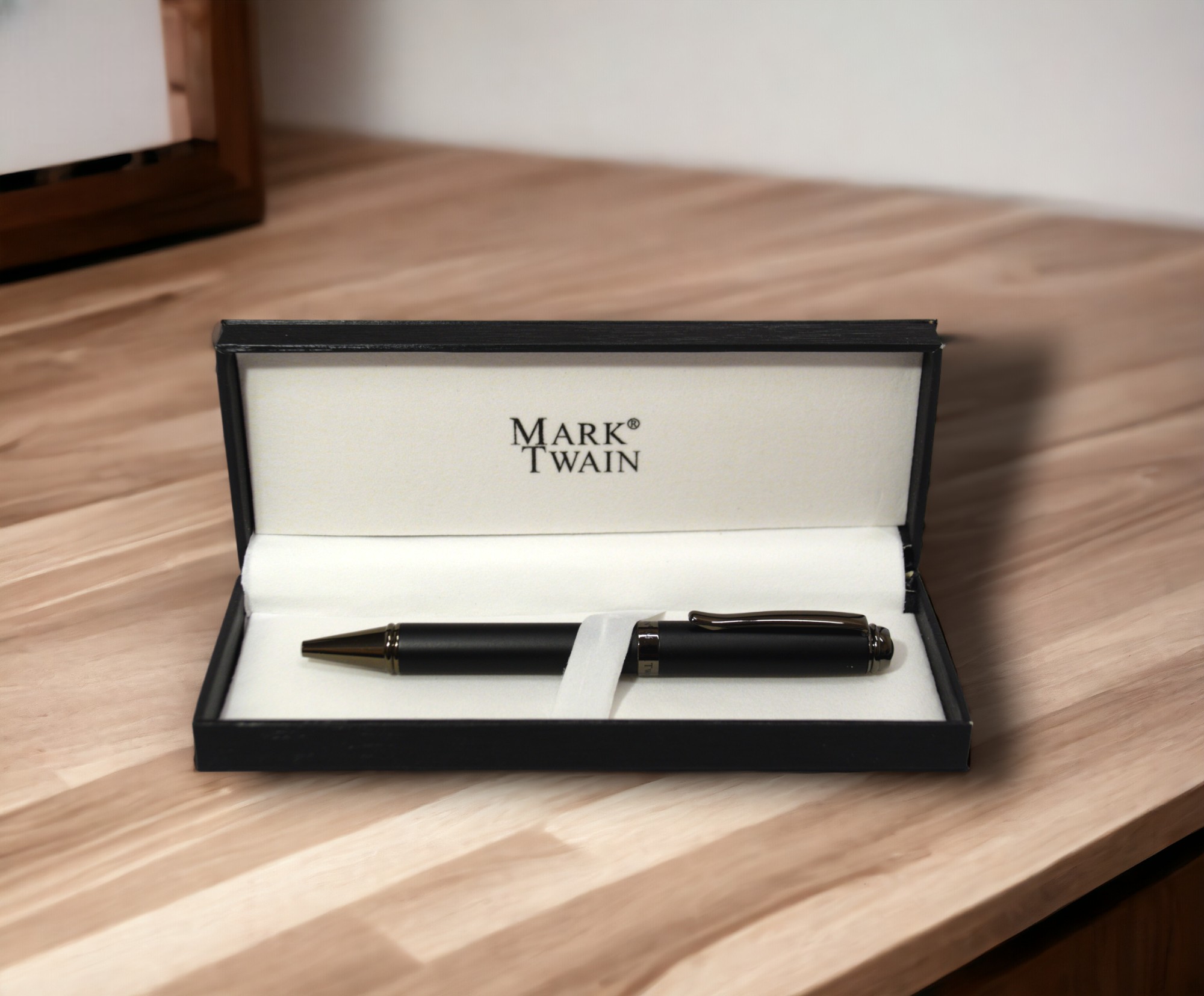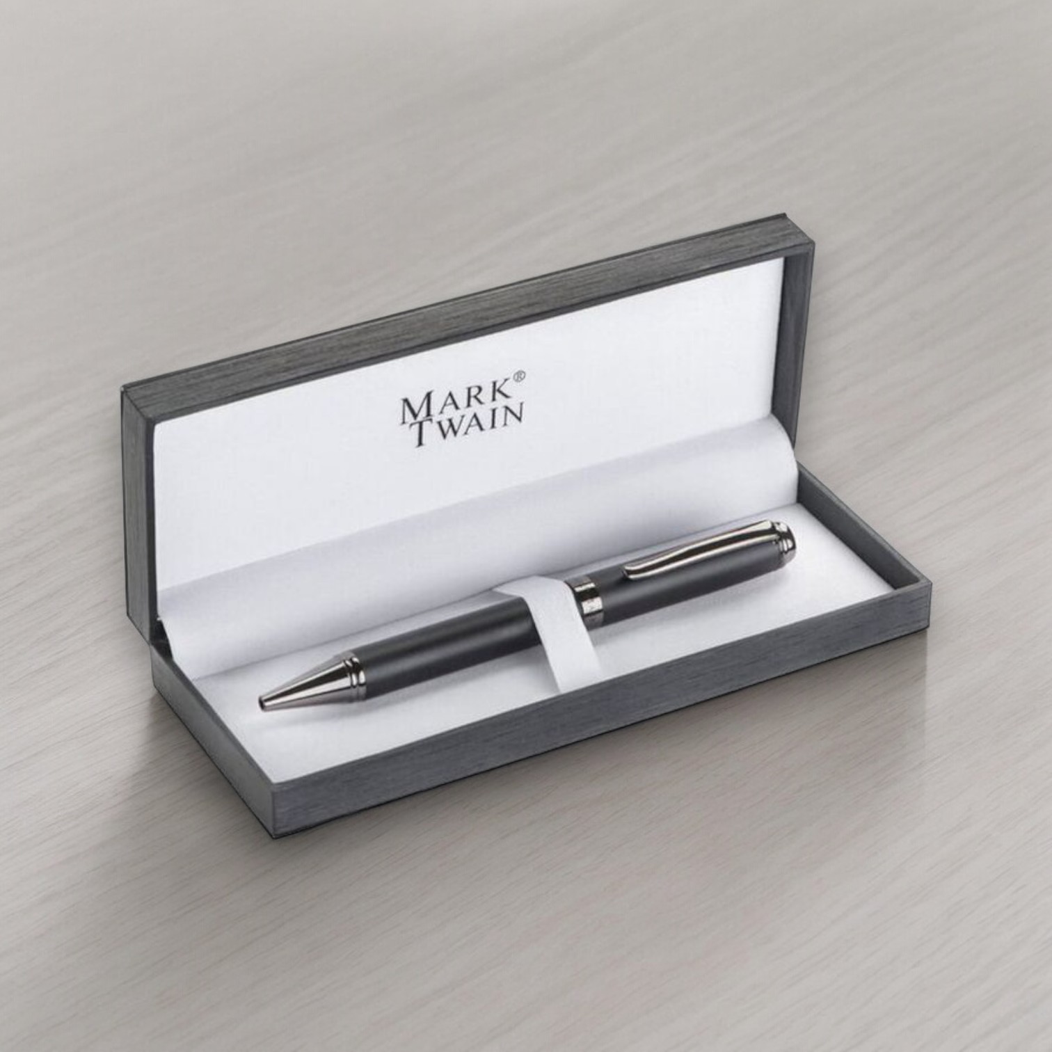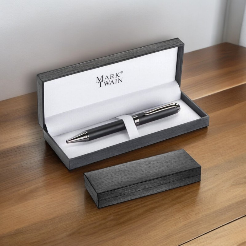 Mark Twain fém golyóstoll, sötét krómozott elemekkel, matt hatású fekete, szépen gravírozható gumi bevonattal, kéken fogó betéttel.