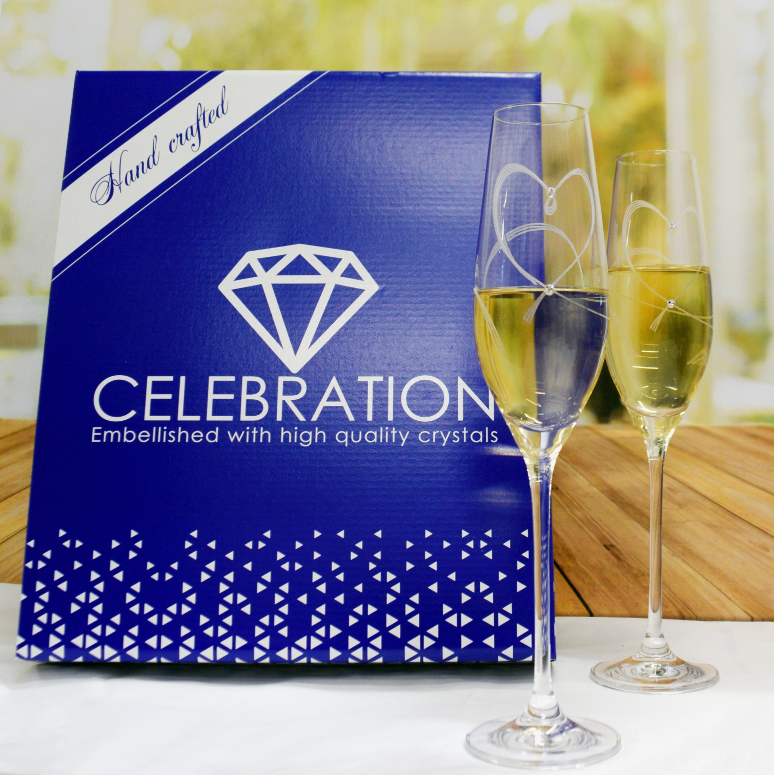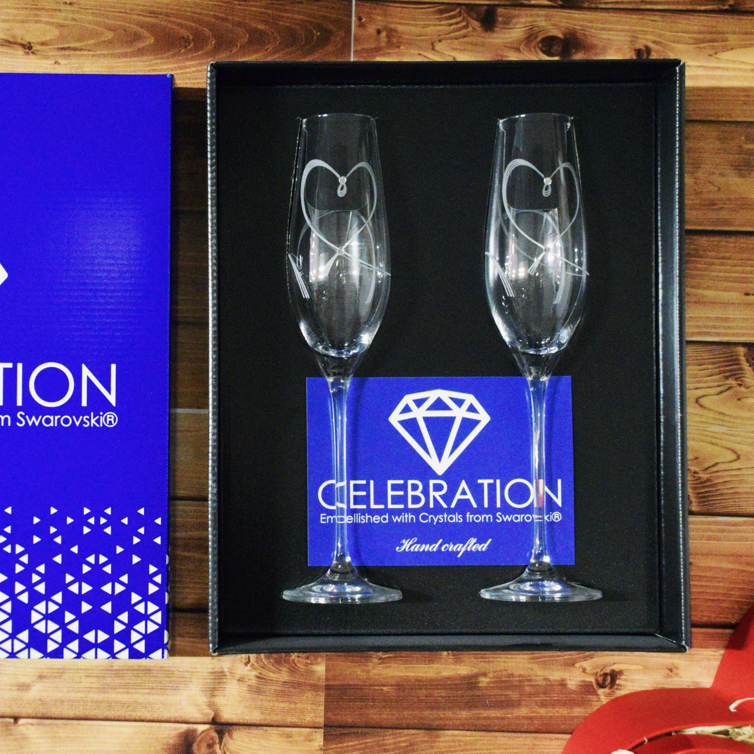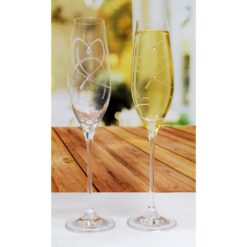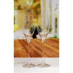 2 db-os kristály pohár pezsgős szett, szív mintával 2 – 2 db prémium kristállyal ellátva elegáns díszdobozban. Tisztítása csak kézzel javasolt. Űrtartalma: 2 x 210 ml. A pohár közelítő mérete: 27 x 6,5 cm.
