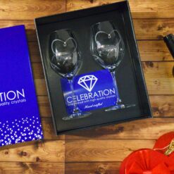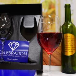 2 db-os kristály borospohár szett vörösborhoz, szív mintával 2 – 2 db prémium kristállyal ellátva elegáns díszdobozban. Tisztítása csak kézzel javasolt. Űrtartalma: 2 x 247 ml. A pohár közelítő mérete 24 x 8,5 cm.